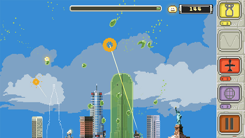 In "Mr. Missile" the player helps a young girl and her robots save various cities and landmarks around the world from falling slime in gameplay reminiscent of the Atari classic "Missile Command."